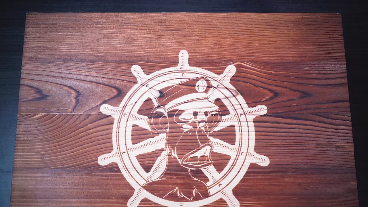The custom designed wooden chest comes packed with a twisted glass decanter, a matching twisted glass stopper, a set of matching twisted glasses, and with a pair of brown leather coasters.
